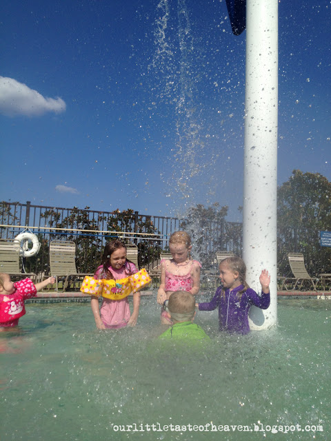 And, then somehow magically the huge dump of water landed way to the side. Does this make sense? And for some reason, Violet still ended up in the water. haha. Good thing Emma has her floatie on to keep Violet safe from the water that didn't actually knock her over.